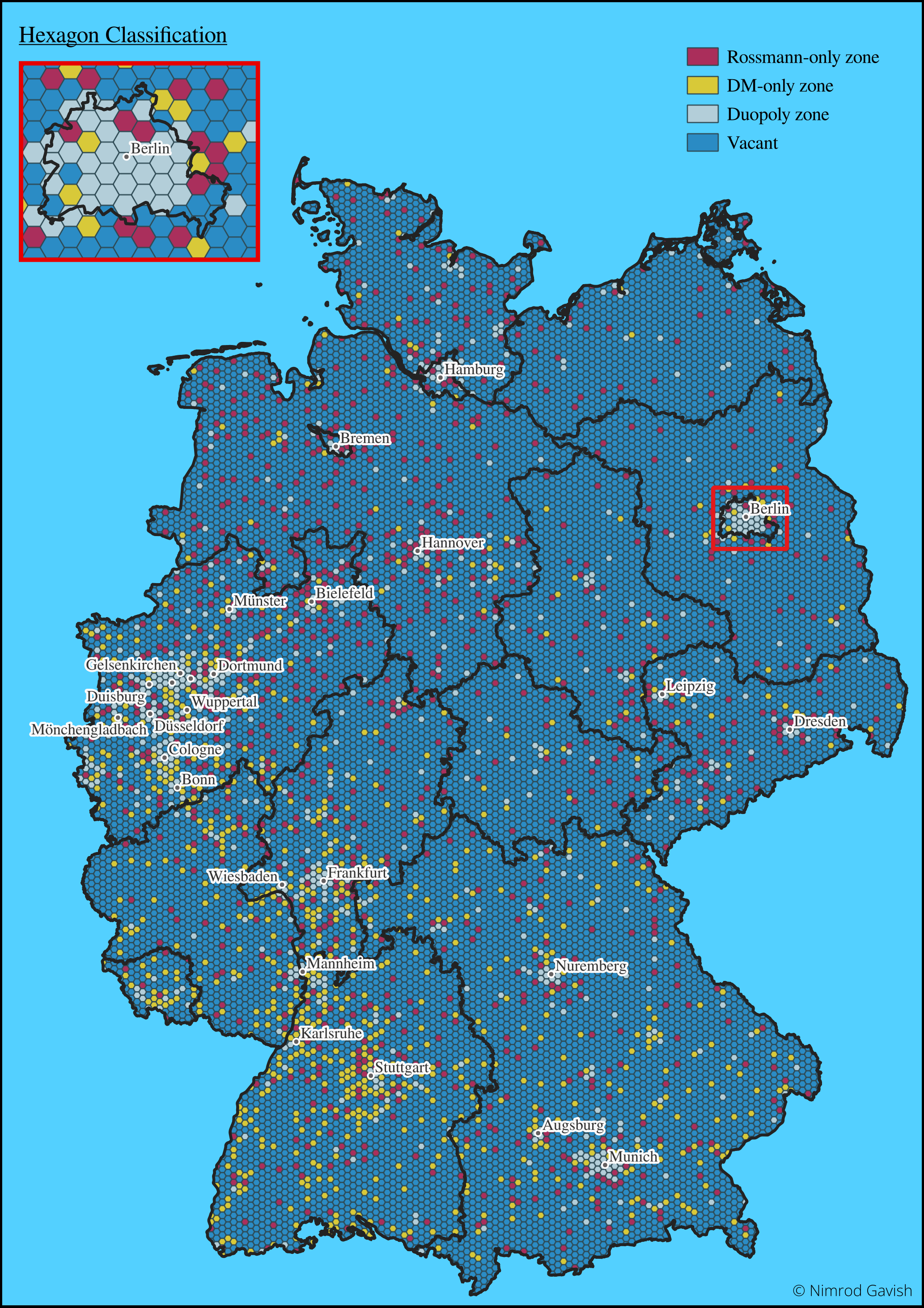 City Analysis: We create a 5-km hexagon grid for Germany, counting of DM and Rossmann locations per cell, and classifying into 4 categories (see Legend in top-right):