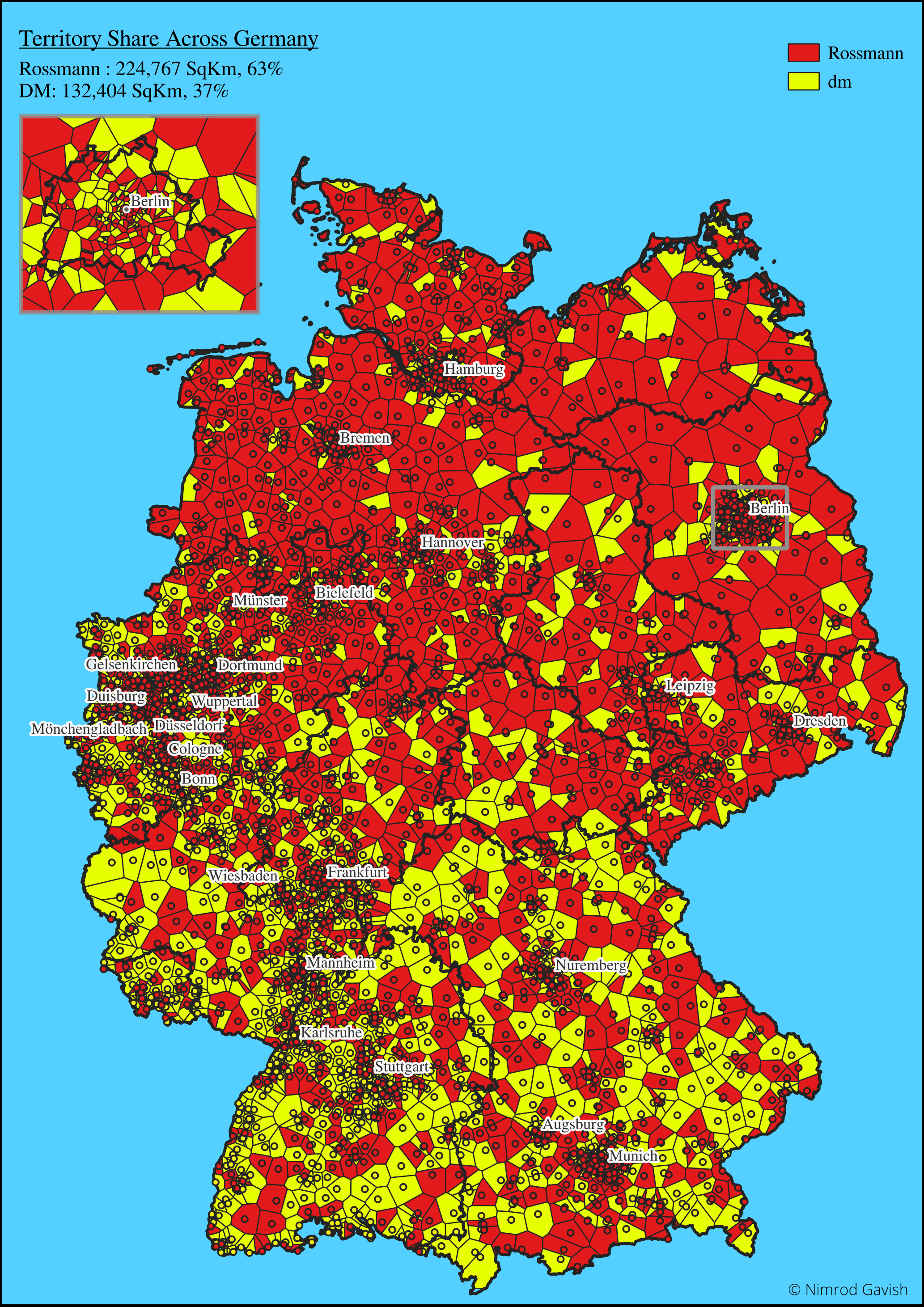 Voronoi Polygons around each store location for each brand. With this approach, each store is assumed to "own" the closest surrounding area, and thus each zone is a theoretical potential market. Keeping that in mind, DM covers 37% of Germany, whilst Rossmann covers 63%. In cities, the share is heavily fragmented and divided, as can be seen in Berlin: